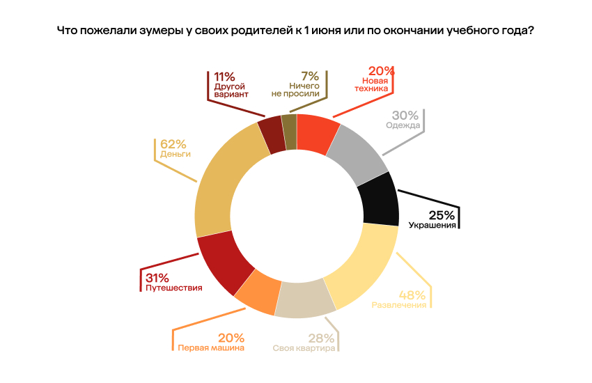Зумеры в качестве подарков просят у родителей: деньги (62%), развлечения (билет на концерт любимого исполнителя, походы в ресторан, 48%), путешествия (31%), одежду (30%) квартиру (28%), украшения (25%) и другие.