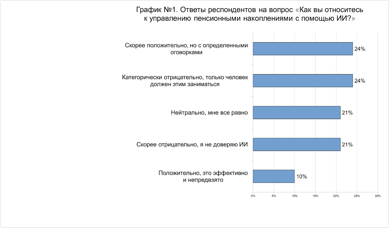 Отвечая на вопрос «Как вы относитесь к управлению пенсионными накоплениями с помощью ИИ?», из тех, кто был против, четверть опрошенных (24%) заявила, что относятся к такой идее скептически, еще 21% — категорически против такой возможности. И только каждый десятый участник исследования безоговорочно готов доверить ИИ управление своими финансами. Подробнее ответы представлены в Графике № 1.